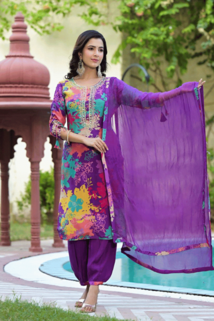 | Deep purple PURE COTTON FULLY FLAIRED ANGRAKHA HEAVY ANARKALI PRINTED KURTI WITH KIROSHIYA LACES WORK AT FRONT AND ALL OVER THE DUPATTA WITH PRINTED COTTON PANTS AND HANDWORK AT YOLK |