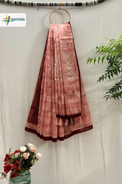 Category: Saree, Code: SA0012, Material: Tasso Silk, Detailing: stripe pattern digital print with ajar border & ancho, Color: Pink, price: 2790 Tk