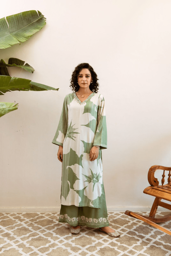 | Category: Stitched Salwar Suit, Material: PURE GERMAN RAYON , Detailing: PRINTED DESIGNER KAMIZ WITH HANDWORK AT NECKLINE AND DESIGNER PRINTED PLAZZO WITH CHINON DUPATTA , Color: OFF WHITE & FERN GREEN |
