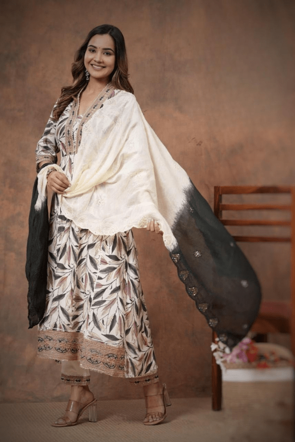 | Category: Stitched Salwar Suit, Material: Regan Cotton, Detailing: V-nack anarkoli with lace and embroidary, half silk DUPATTA WITH EMBROIDARY , Color: Off white and black |